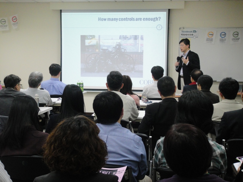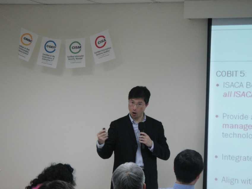 2014年4月22號下午兩點於中華民國電腦稽核協會訓練教室進行此次台北月例會,首先邀請到電腦稽核協會邵之美理事進行主持開場,並邀請到國立中正大學會計與資訊科技學系張碩毅教授進行【IT治理與COBIT5導讀】之演講,向各位學員來賓介紹COBIT與其演進,接下來針對COBIT5進行導讀,COBIT5套書內含:企業IT治理:營運架構、企業IT治理:建置以及企業IT治理:促成流程與方法,共三本。最後張碩毅教授說明COBIT5對企業營運上的效益,並讓各位學員了解到COBIT5的重要性。