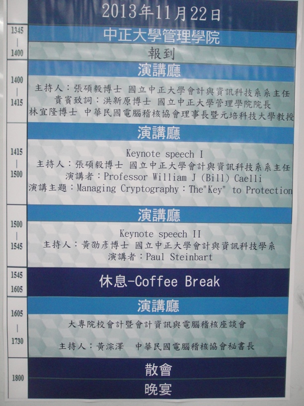日期:2013/11/22~11/23地點:中正大學主題:Cyberspace 2013鑑識會計與個人資料保護國際論壇