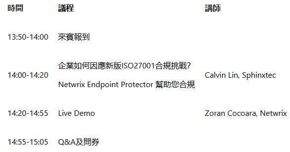 欣盟科技 資安小講堂-今年10月大限倒數,企業如何因應新版ISO27001合規挑戰? ISO27001 轉版規劃您都準備好了嗎?舊版證書將於 10 月底到期,相較於舊版聚焦於「存取控制、加密、資訊分類」,新版新增 11 項控制措施,其中凸顯了資料外洩防護的重要性。加入本場研討會,掌握新版合規要點,了解 DLP 解決方案如何協助您化解挑戰。